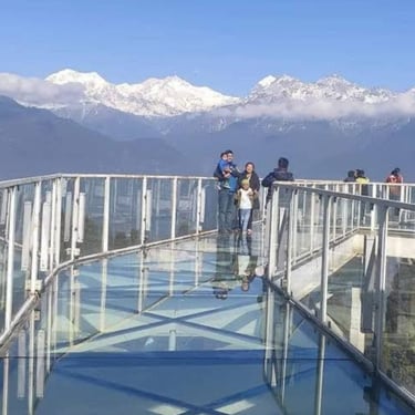 The main attraction, however, is the Pelling Skywalk, a glass-bottomed bridge overlooking a giant statue of Chenrezig (Avalokitesvara). Standing there, with clouds floating beneath your feet, is both thrilling and meditative. Nearby attractions include Rimbi Waterfalls, Kanchenjunga Waterfalls, and Khecheopalri Lake — each offering peace and photogenic beauty.
